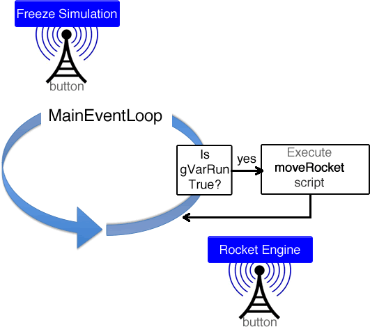 On the card script there is a procedure called "MainEventLoop" that creates a loop. A second procedure called "moveRocket" is triggered during each loop. This loop continues as long as the global variable "gVarRun" is true. While the loop is executing, LiveCode is able to "listen" to any buttons (or other events) that might also be triggered. In this project, there are two buttons that the user can press. The first turns on and off the rocket's engine. The second button allows the user to "freeze" or "unfreeze" the simulation (this is useful when developing the app, but is something that would be hidden, or deleted, after the app is finished and ready to be distributed).