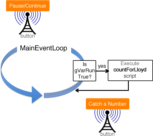 I will explain how this works during the workshop, but the important point to be made here is that the structure is exactly the same as that used in Lunar Hotel Shuttle. Here is an illustration of how the simulation loop works: